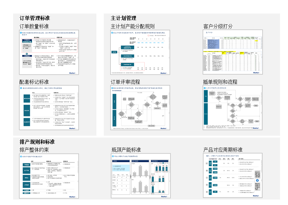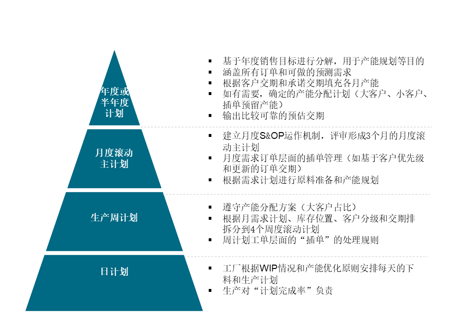 - 从整体设计、主计划、周计划和日计划执行,建立完整的计划管理体系框架。规范订单评审、插单和置换流程,制定产能、周期标准和工单优先级评估等,提升计划排产合理性