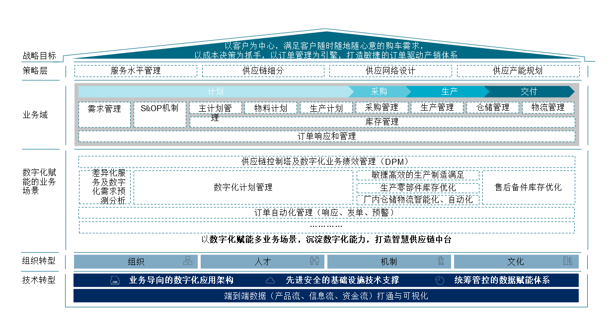 从需求、计划、采购、物流整个供应链端到端板块入手,设计拉通协同的流程,实现以需求为导向的多种供应策略的业务模式